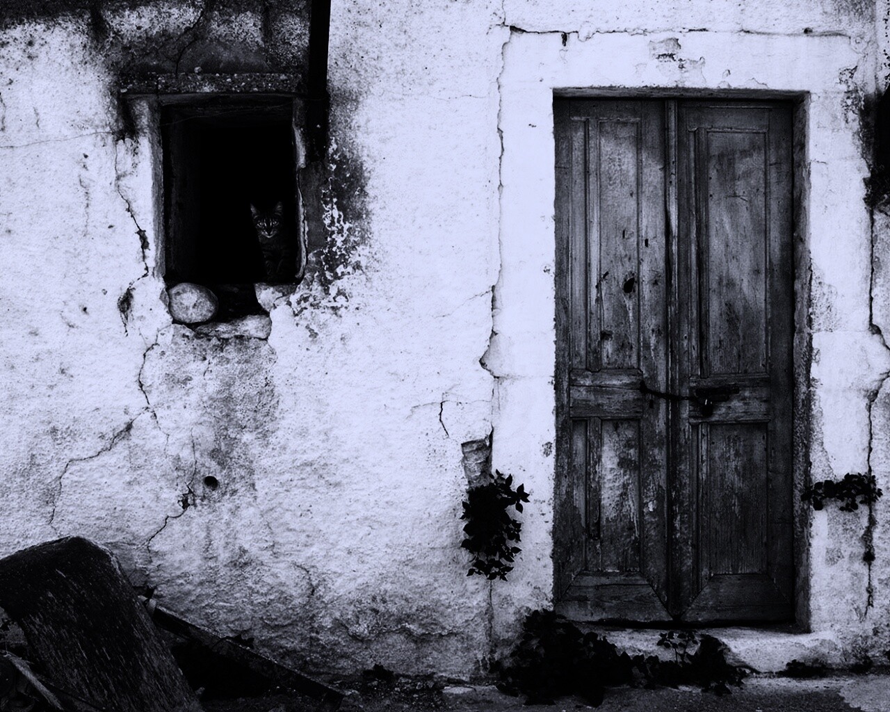 «Кот выглядывает из разрушенного дома»