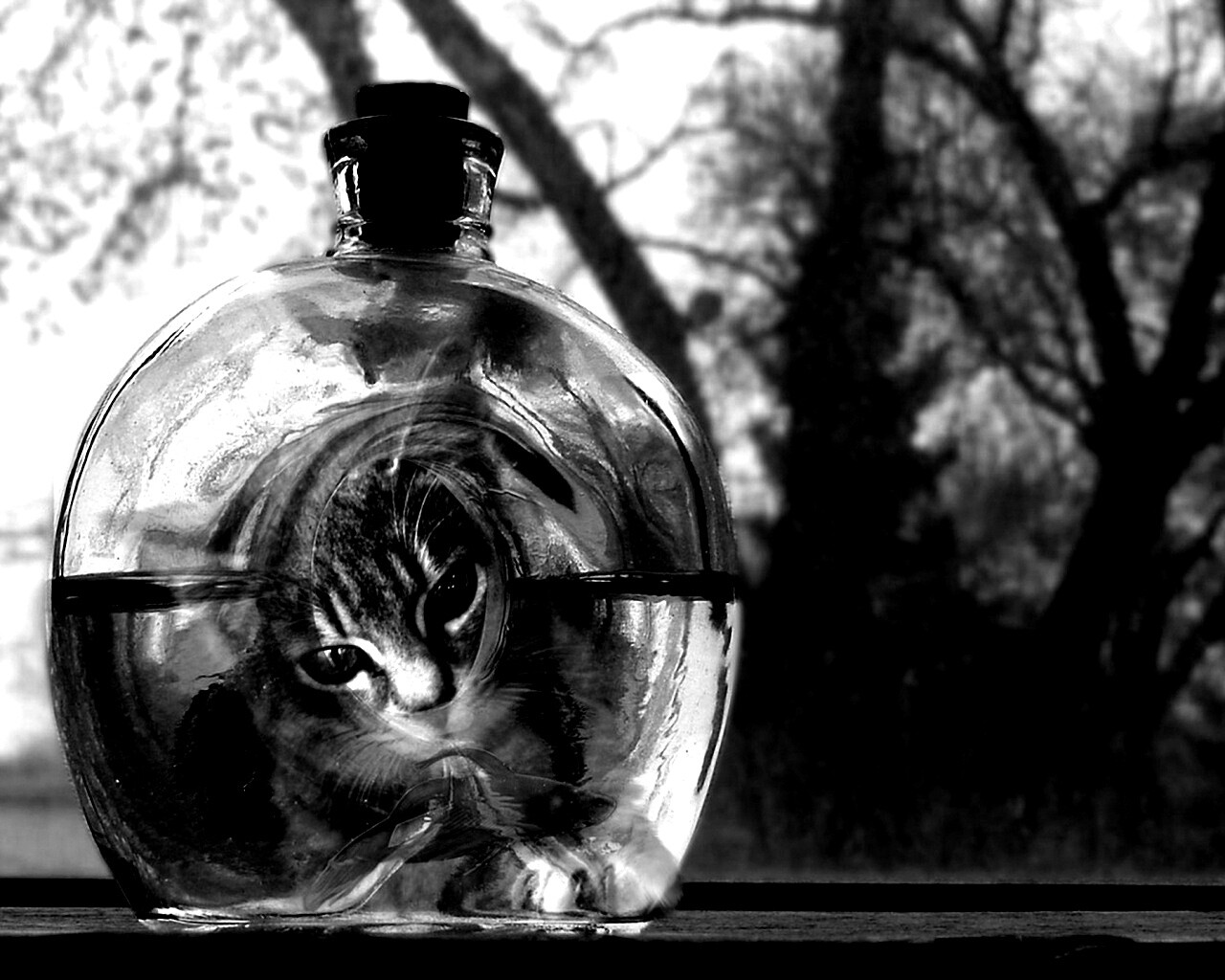 «Кот наблюдает за рыбкой в бутылке»