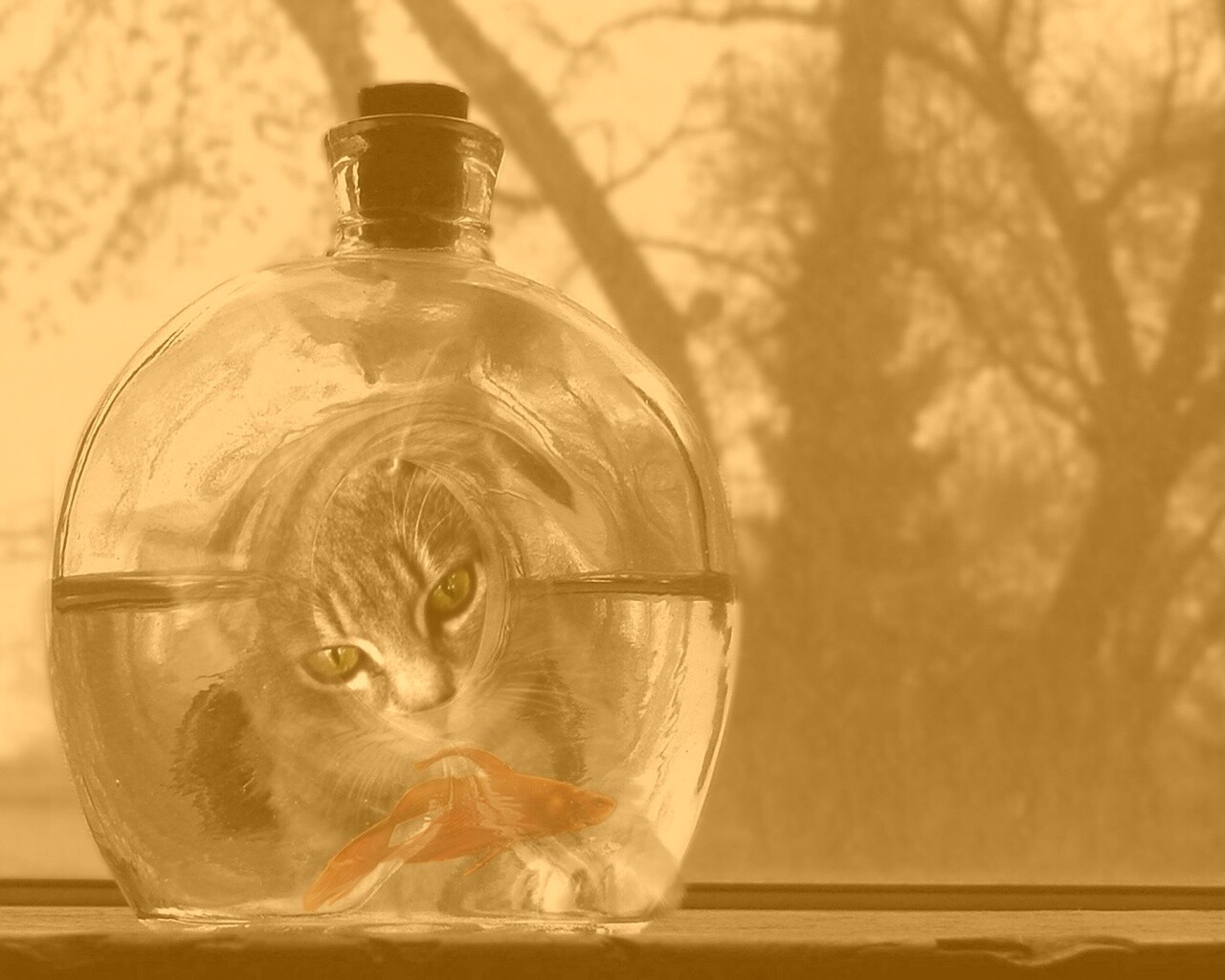 «Кот наблюдает за рыбкой в бутылке»