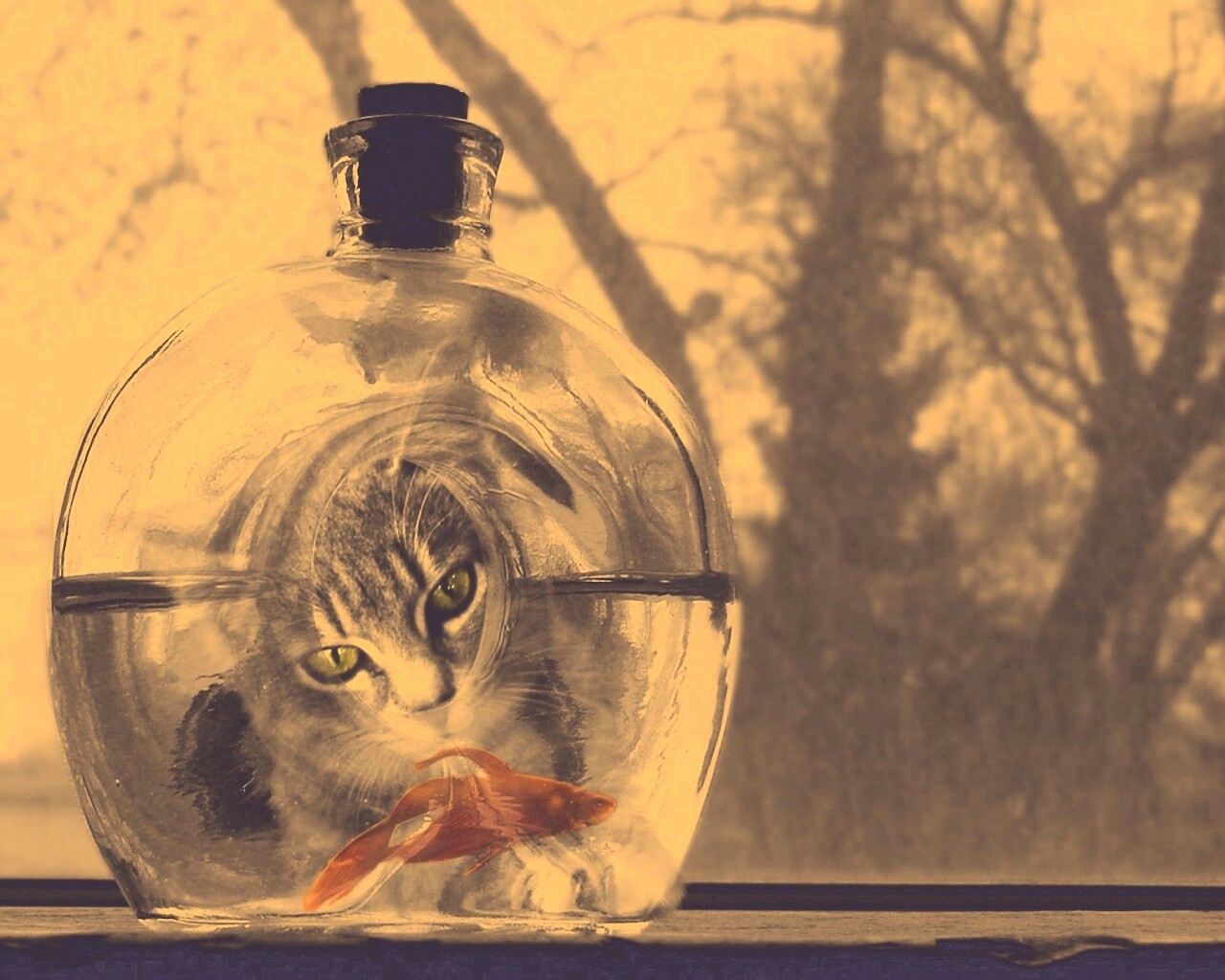 «Кот наблюдает за рыбкой в бутылке»