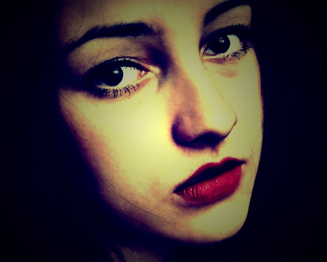 «Брюнетка с ярким макияжем и печальным лицом»