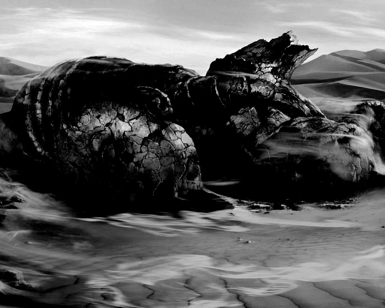 Обои для рабочего стола «Развалины статуи в пустыне» 1280х1024 с фильтром inkwell (оригинал 1920х1080)