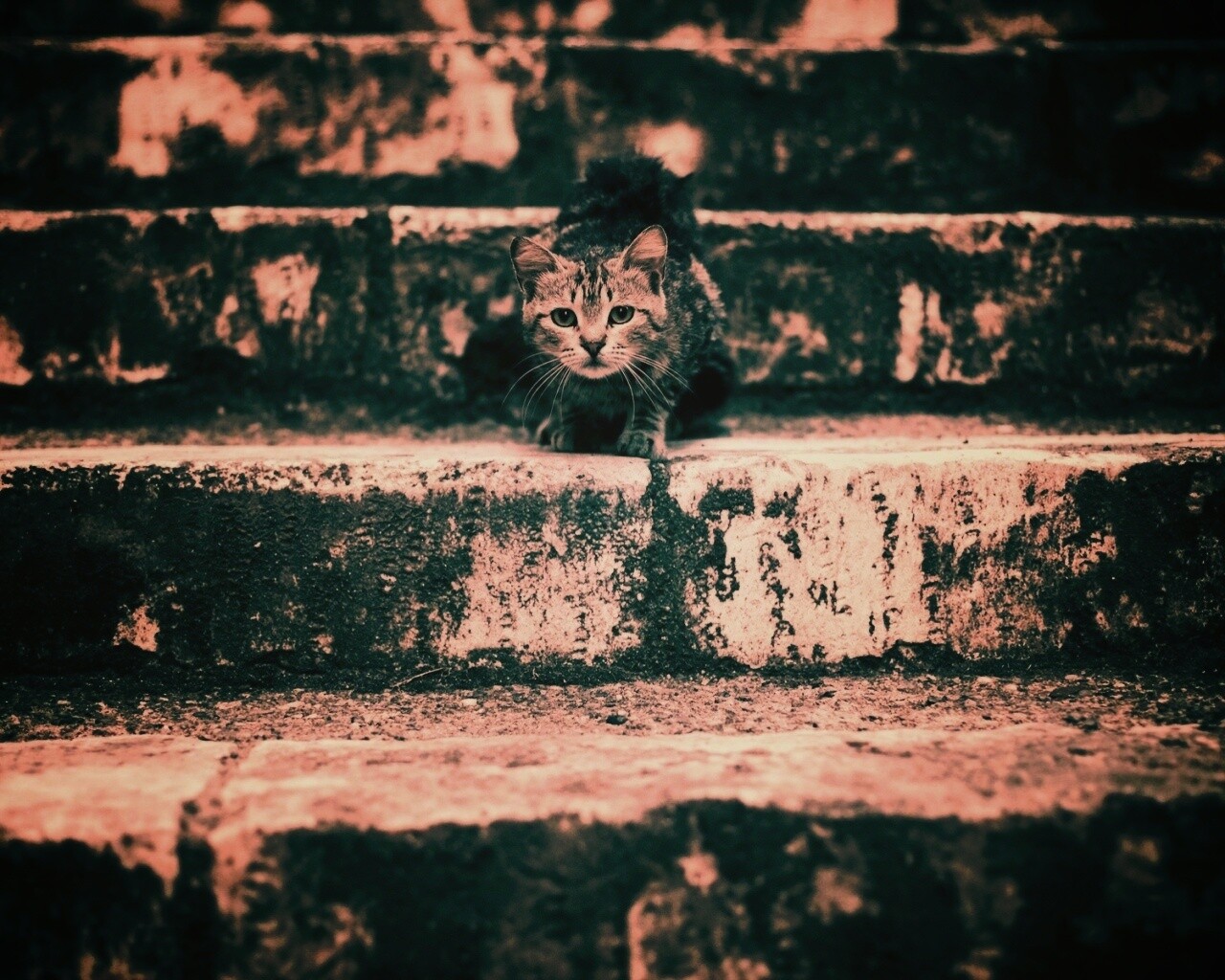 «Растрепанная кошка на ступеньках лестницы»