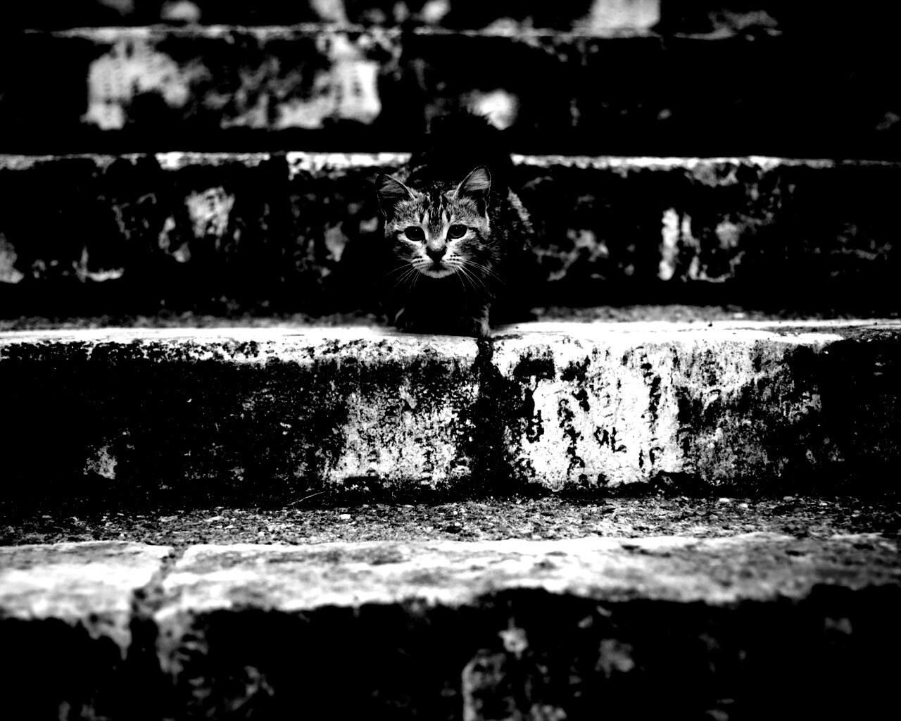 «Растрепанная кошка на ступеньках лестницы»