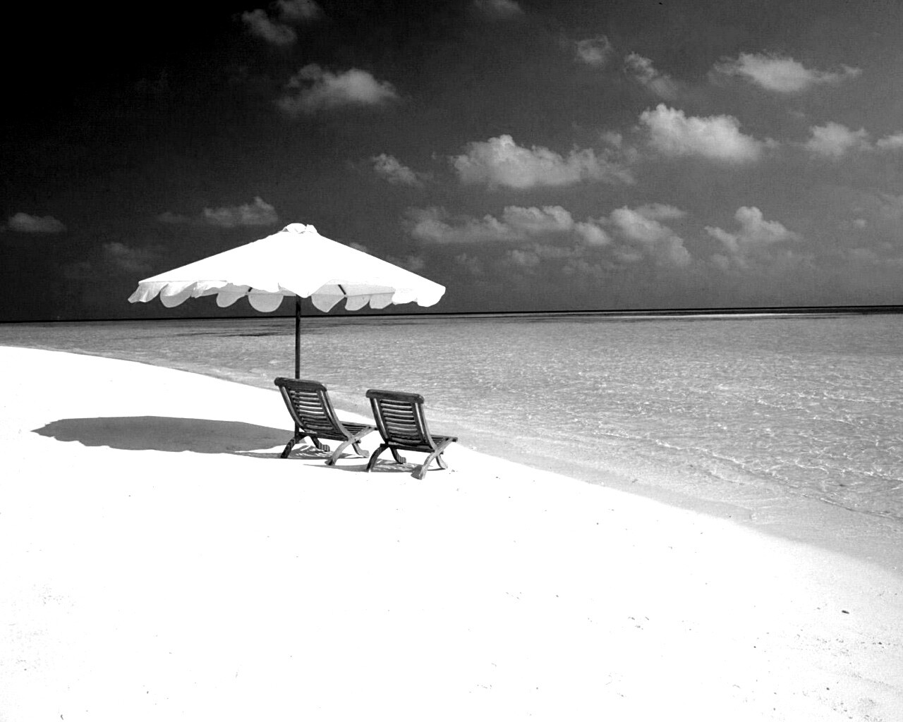 «Песчаный пляж с двумя жезлонгами»