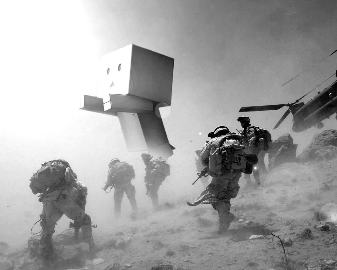 Обои для рабочего стола «Картонный человек среди солдат» 1280х1024 с фильтром inkwell (оригинал 1920х1200)