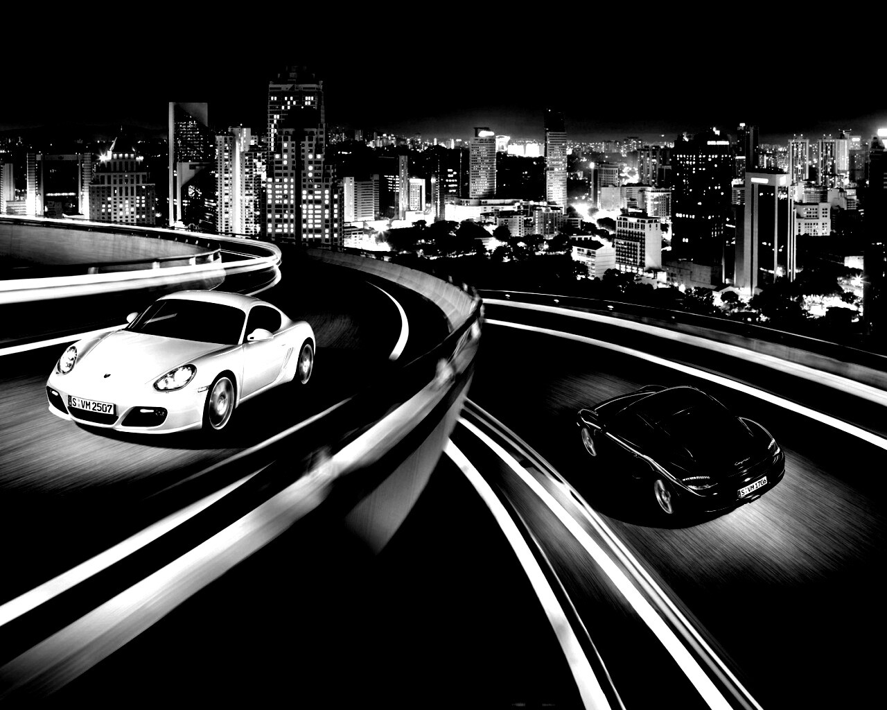 «Черный и белый Porsche на автомагистрале.»