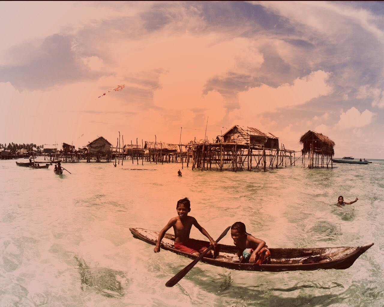 «Дети в лодке у поселения туземцев»
