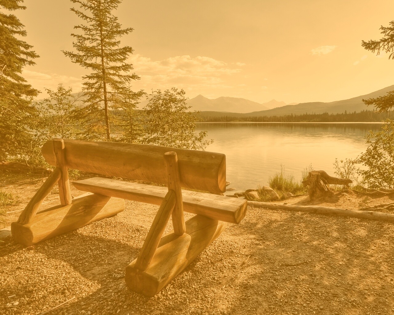 Обои для рабочего стола «Деревянная скамья на берегу озера» 1280х1024 с фильтром kelvin (оригинал 2560х1600)