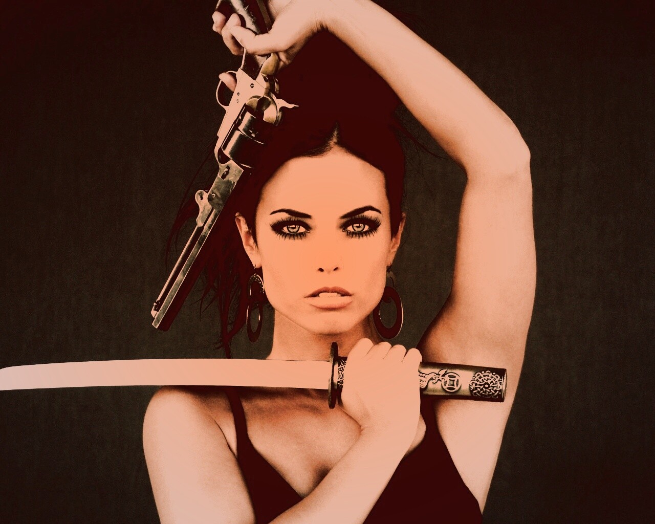 Обои для рабочего стола «Девушка с мечом и пистолетом» 1280х1024 с фильтром toaster (оригинал 2560х1600)