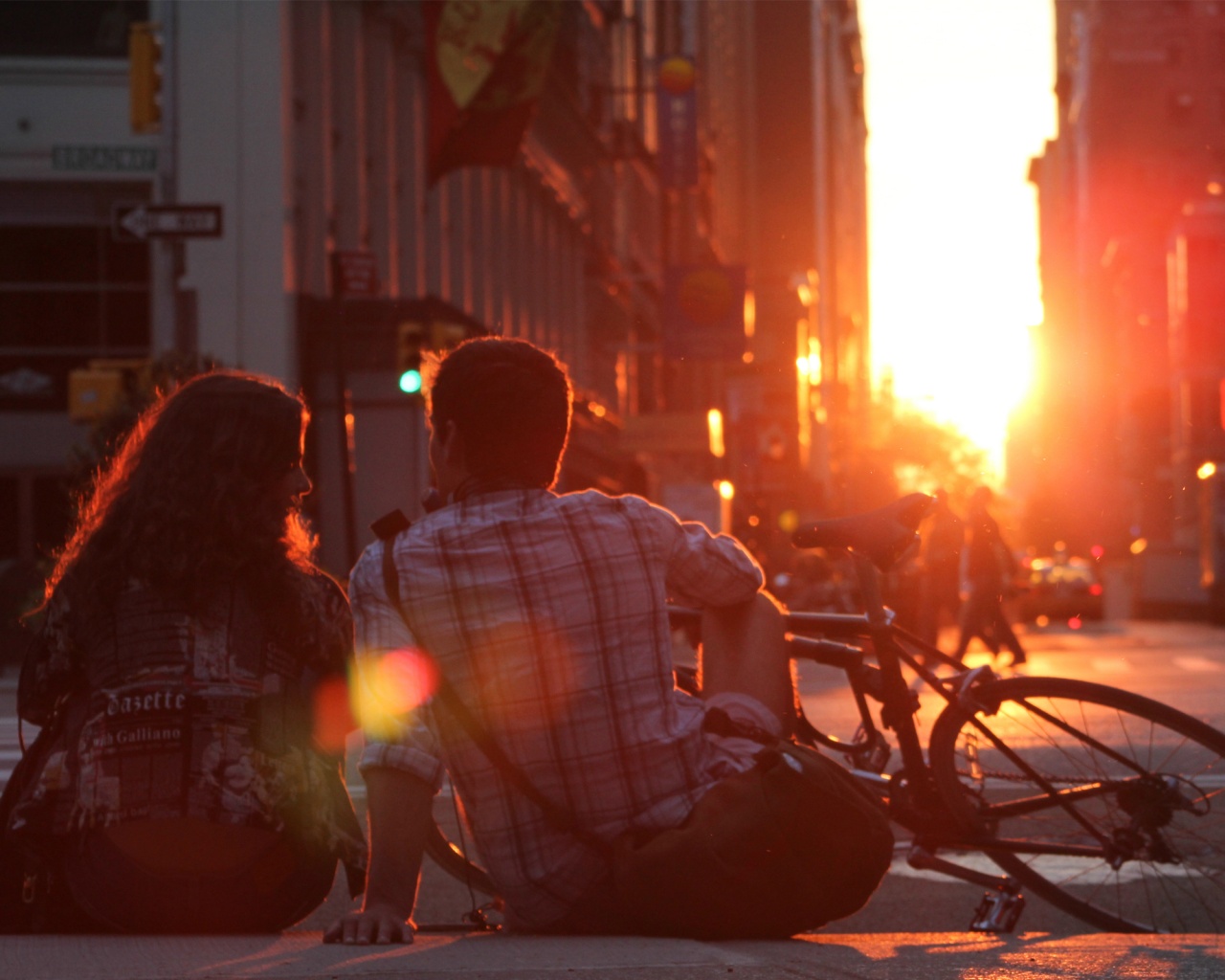 «Девушка и парень с велосипедом на закате»