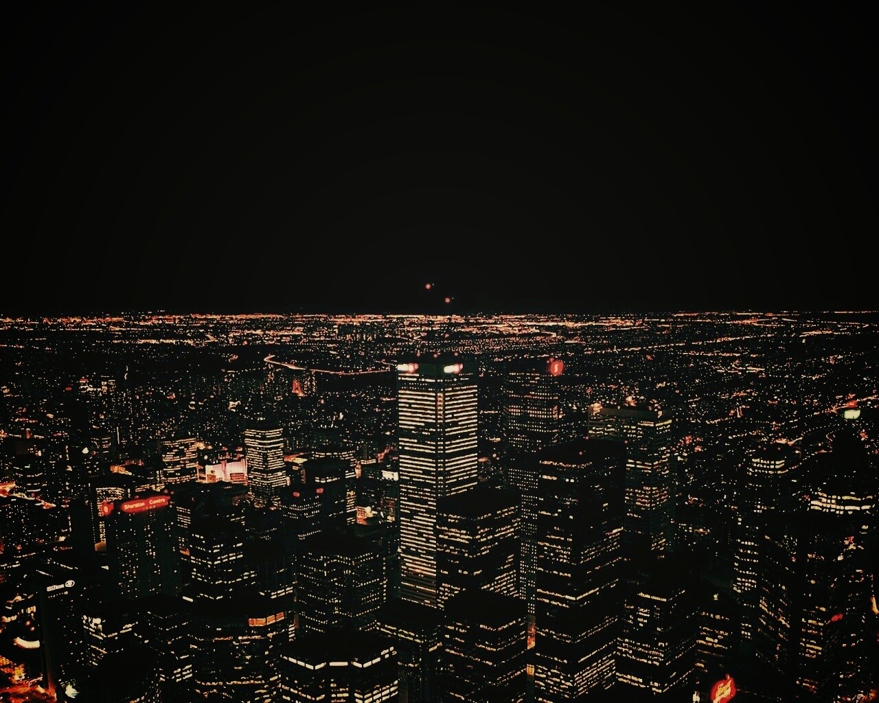 Обои для рабочего стола «Вид на здания ночного города» 1280х1024 с фильтром earlybird (оригинал 2560х1600)