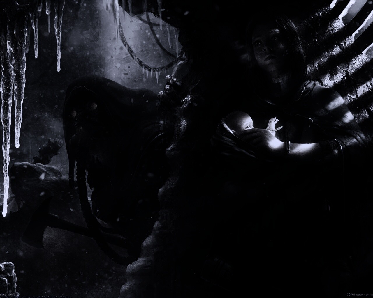 «Девушка с ребенком прячется от монстра»