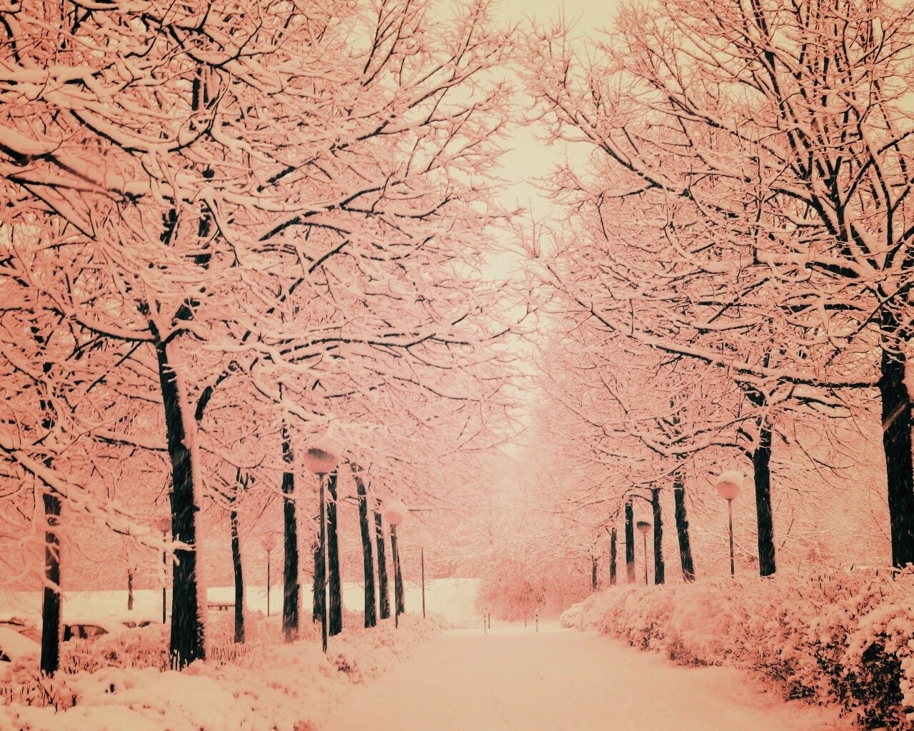 Обои для рабочего стола «Заснеженная аллея» 1280х1024 с фильтром earlybird (оригинал 2704х1764)