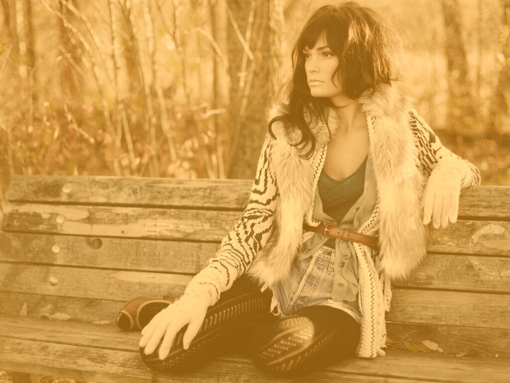 Обои для рабочего стола «Красивая девушка сидит на скамейке» 1024х768 с фильтром kelvin (оригинал 2583х1722)