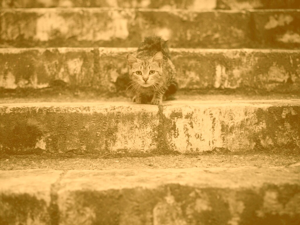 «Растрепанная кошка на ступеньках лестницы»