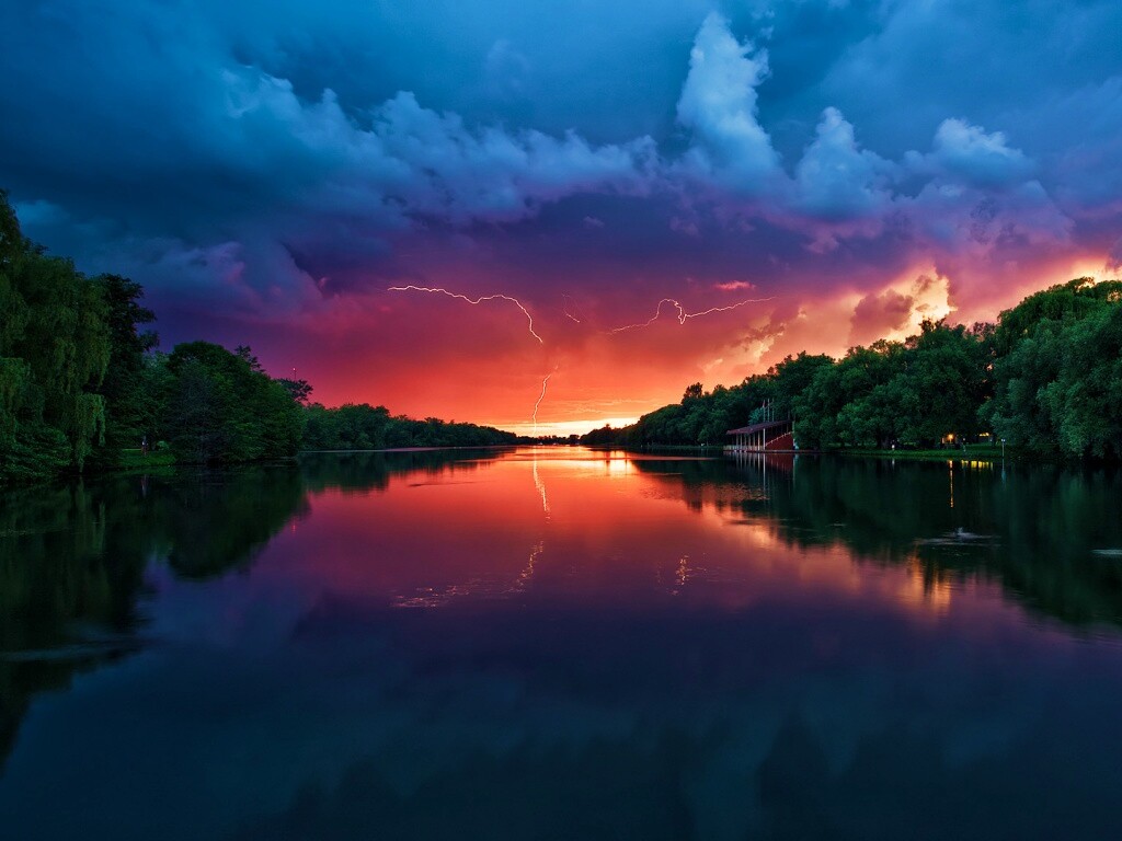 «Молнии на фоне заката, стандартные обои mac»