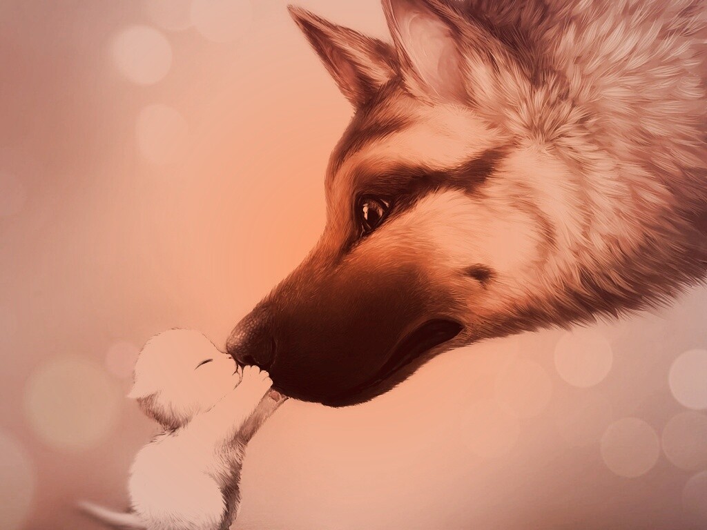 Обои для рабочего стола «Овчарка и котенок» 1024х768 с фильтром toaster (оригинал 1920х1080)
