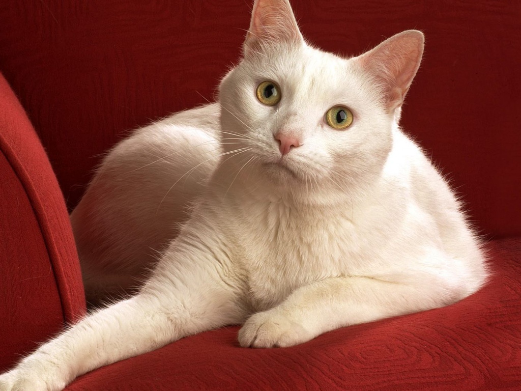 Обои для рабочего стола «Белой кот на красном диване» 1024х768 (оригинал 1680х1050)