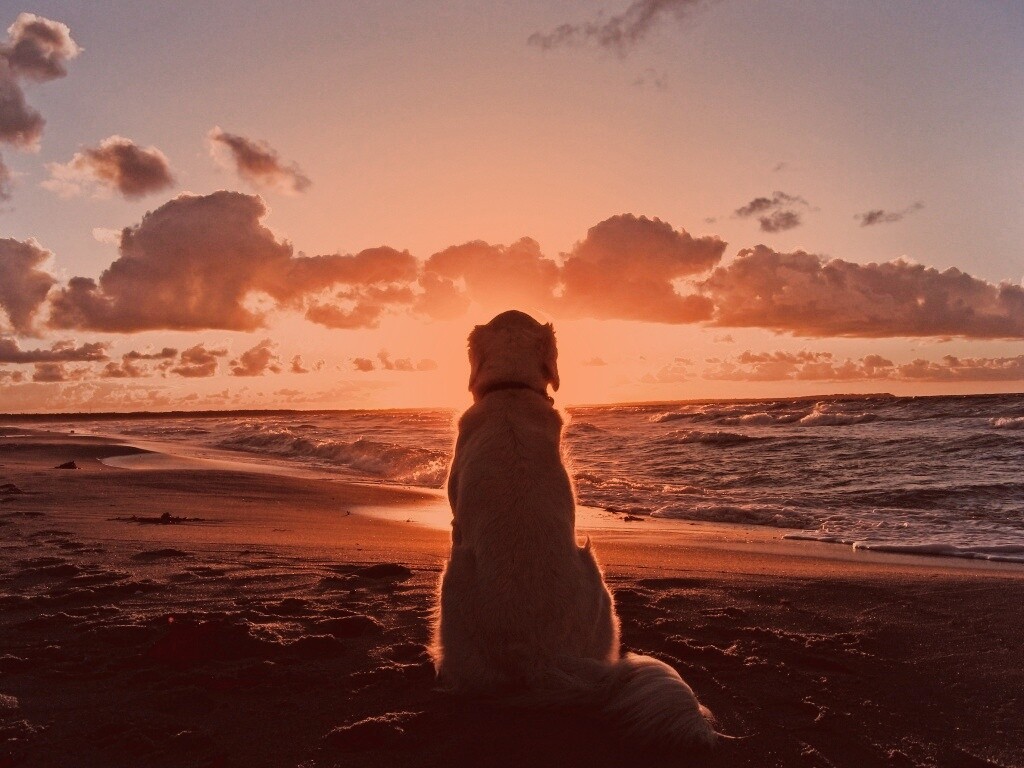 «Собака наблюдающая закат на пляже»