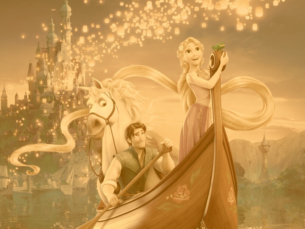 Обои для рабочего стола «Рапунцель принц и конь в лодке» 1024х768 с фильтром kelvin (оригинал 3861х3729)