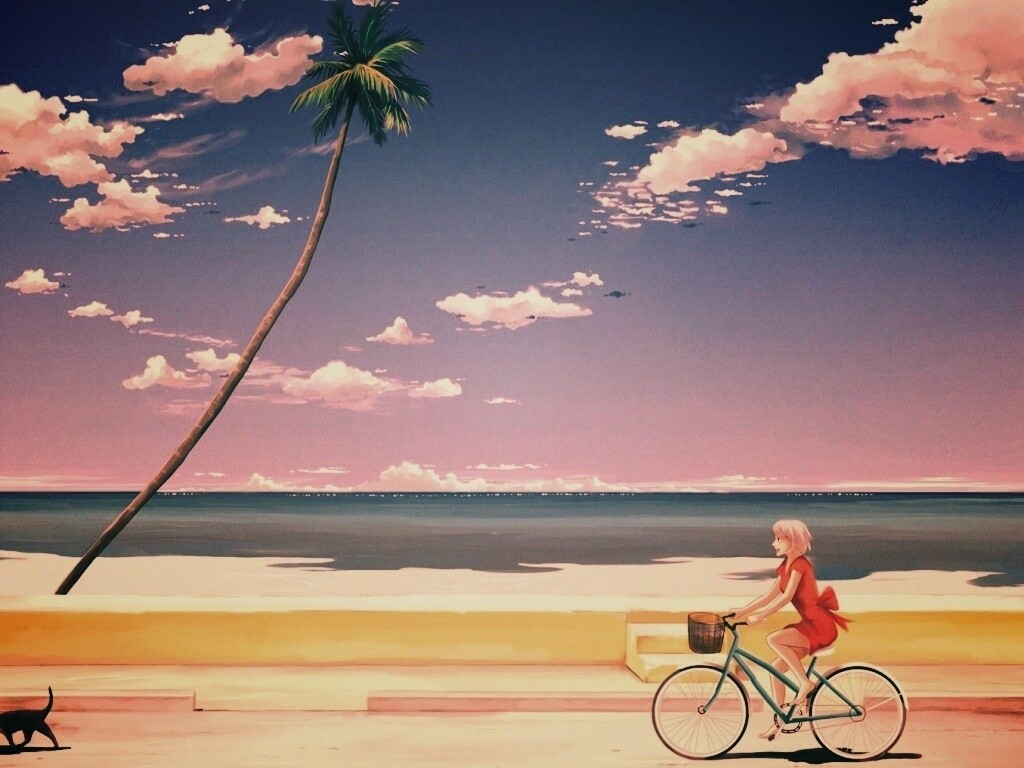 «Девушка едет на велосипеде вдоль берега»