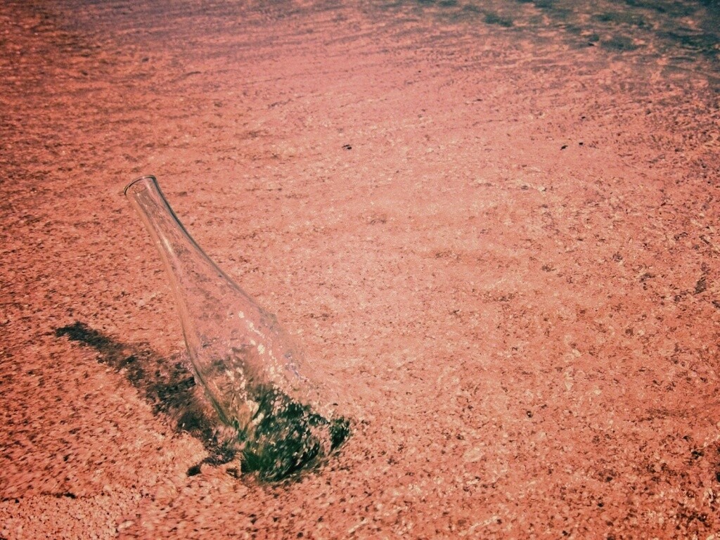 Обои для рабочего стола «Бутылка в песке у воды» 1024х768 с фильтром earlybird (оригинал 1920х1200)