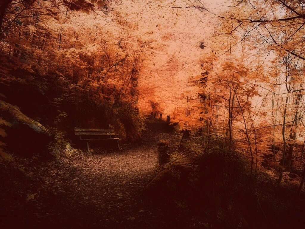 Обои для рабочего стола «Скамейке в чаще парка» 1024х768 с фильтром toaster (оригинал 1920х1200)