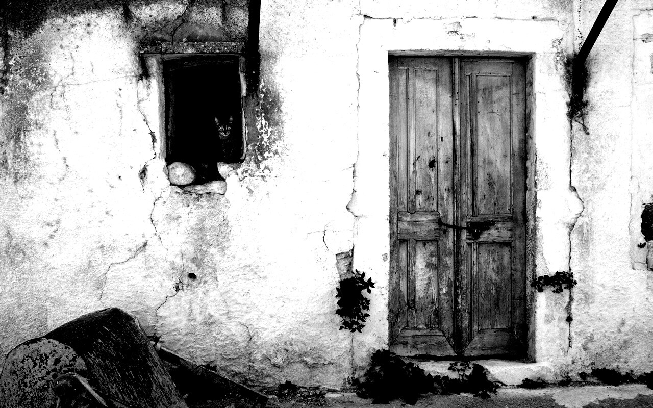 «Кот выглядывает из разрушенного дома»