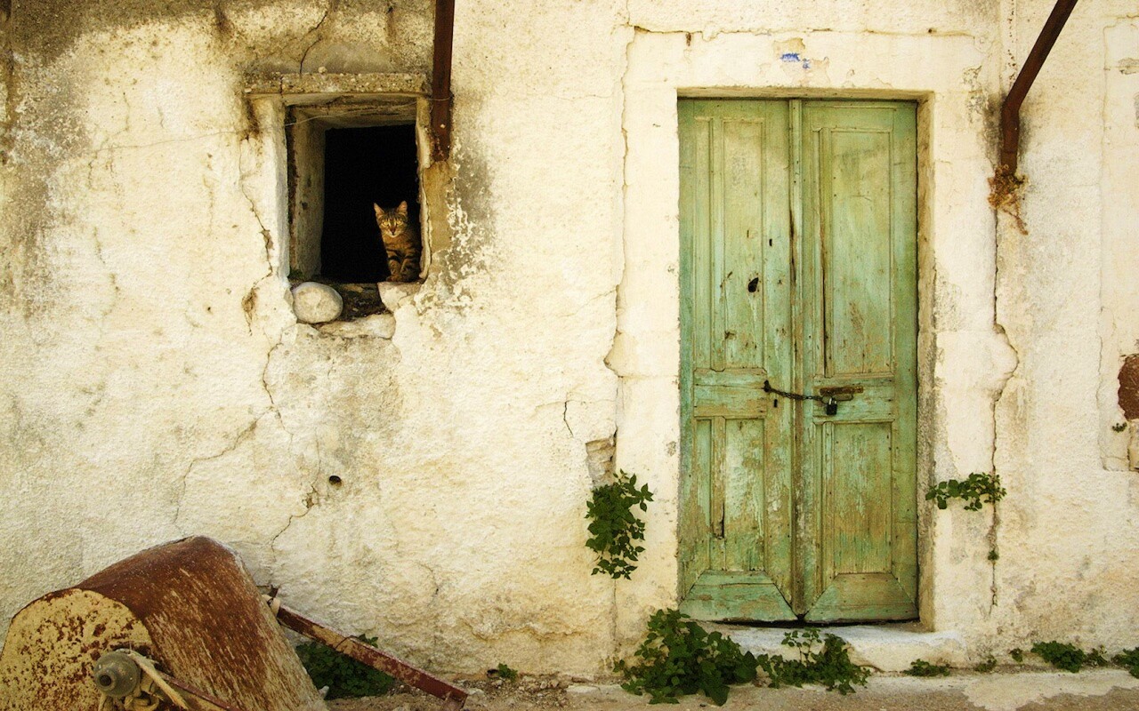 «Кот выглядывает из разрушенного дома»