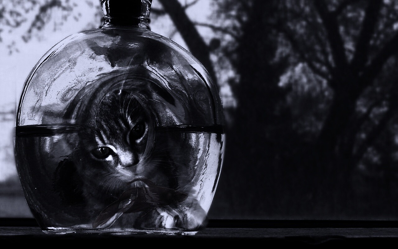 «Кот наблюдает за рыбкой в бутылке»