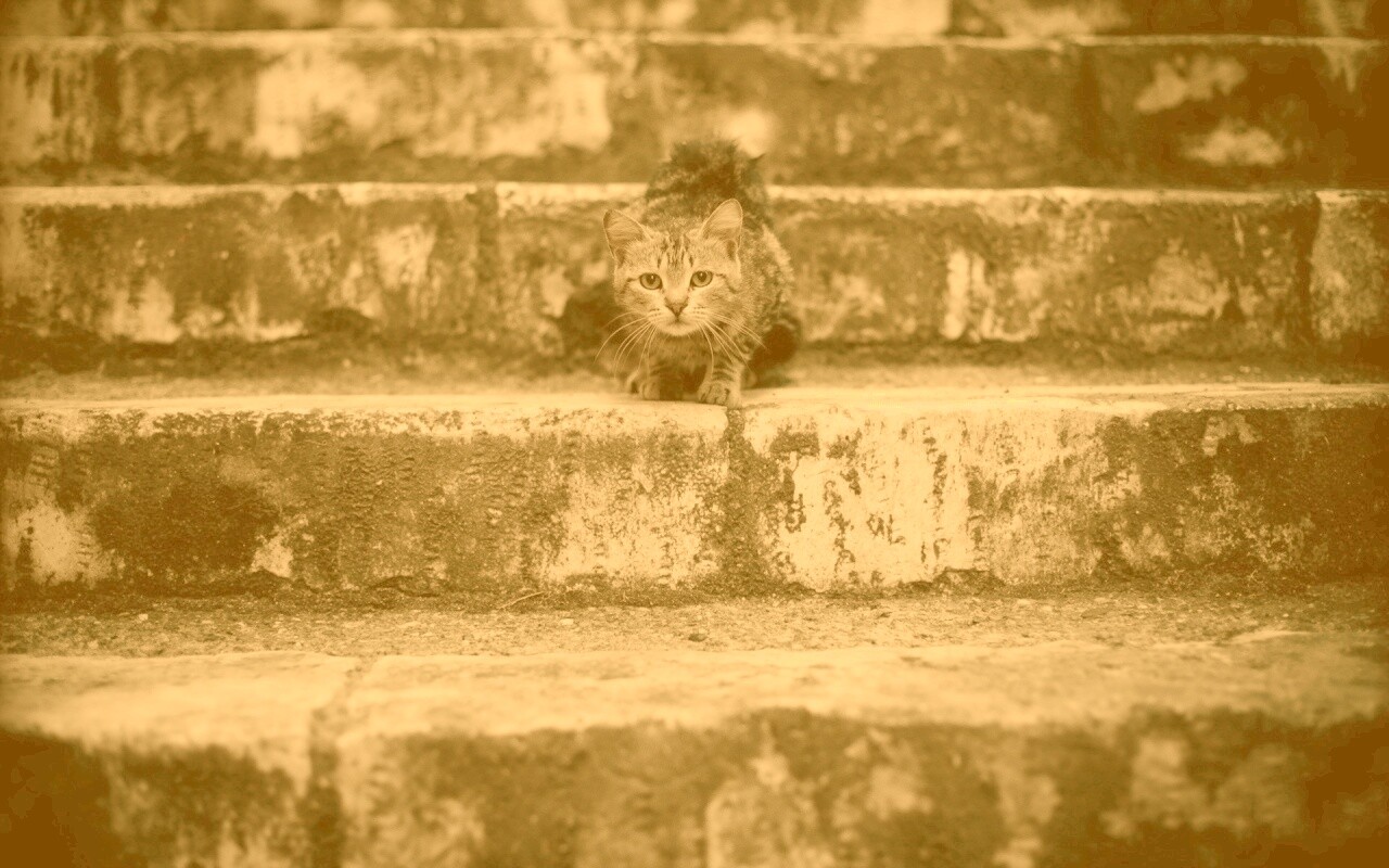 «Растрепанная кошка на ступеньках лестницы»