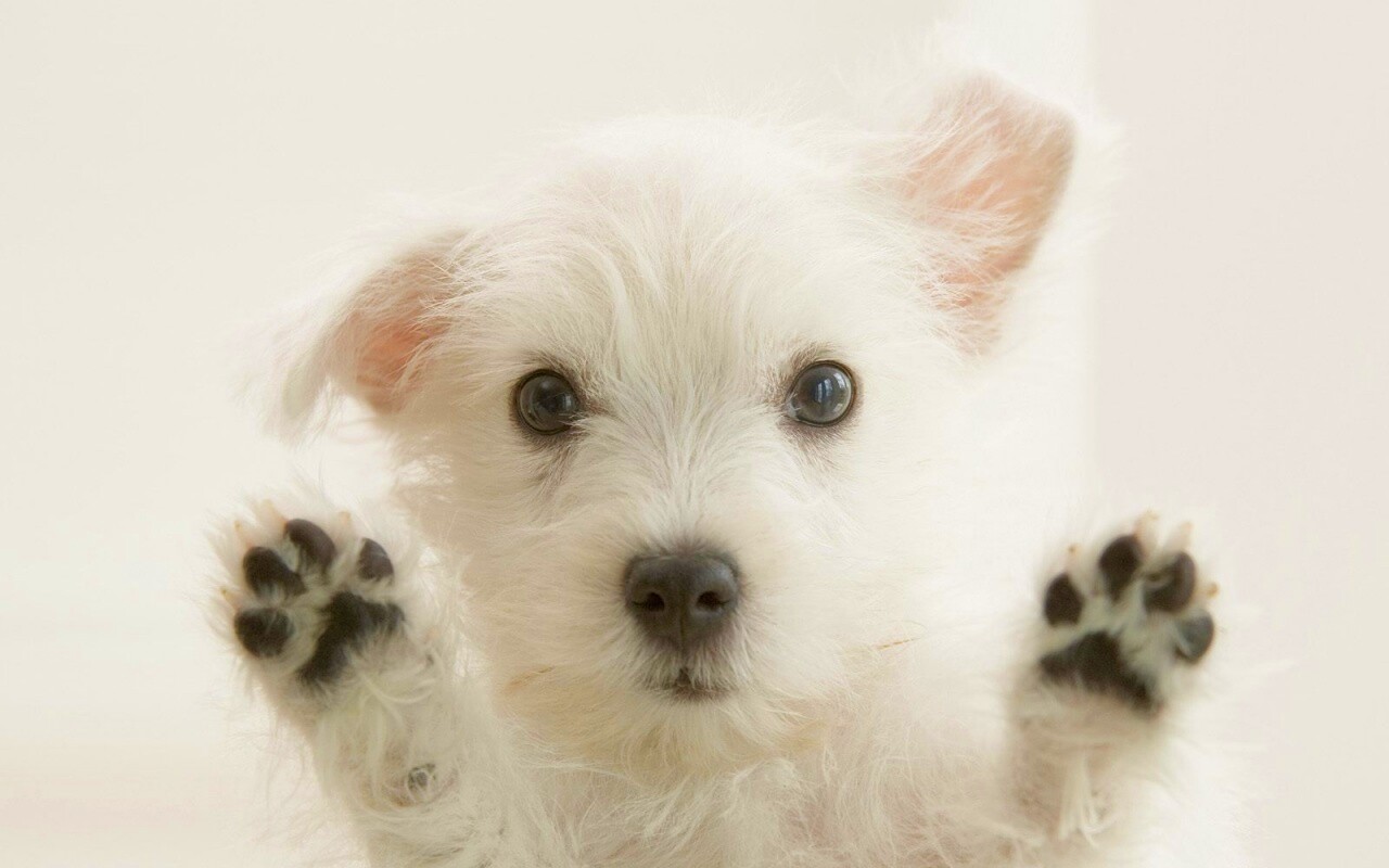 Белый любознательный щенок обои