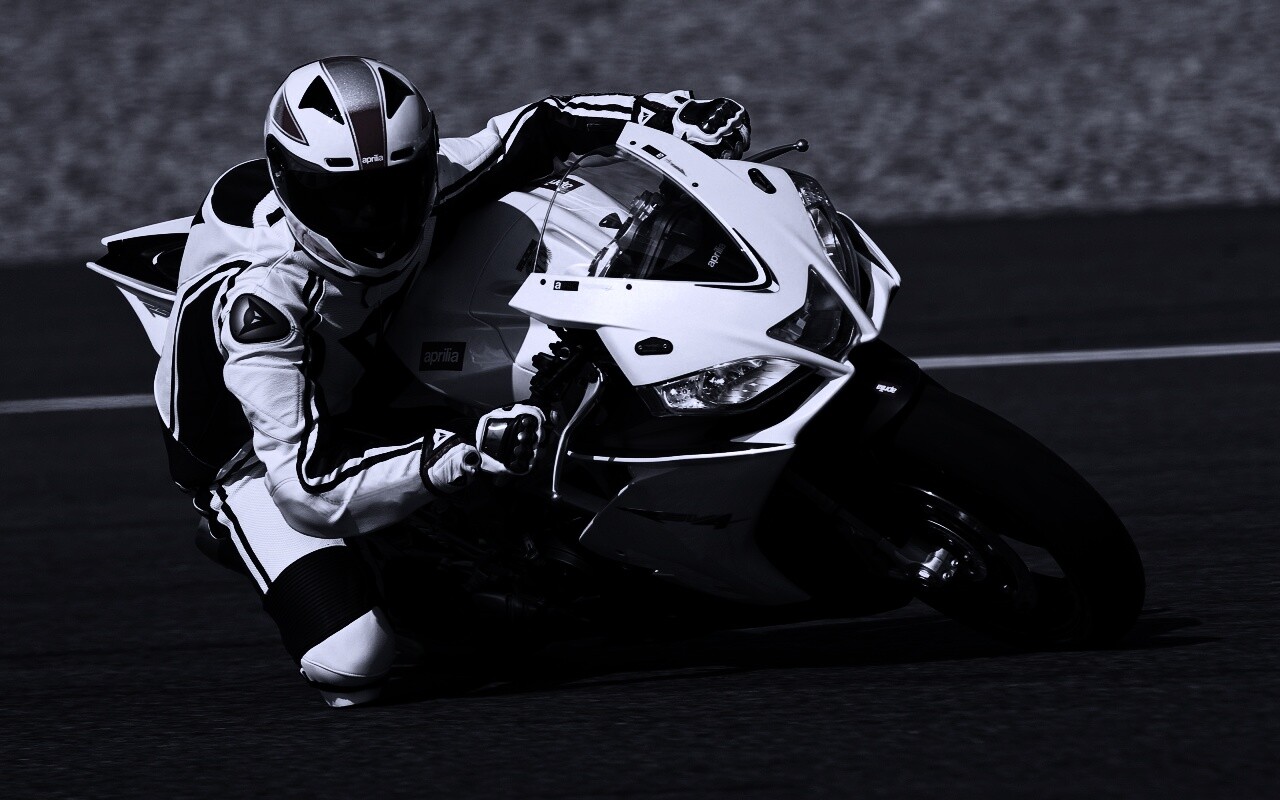 Обои для рабочего стола «Байкер в белой экиперовкена Априлия РСВ4» 1280х800 с фильтром gotham (оригинал 3200х2000)