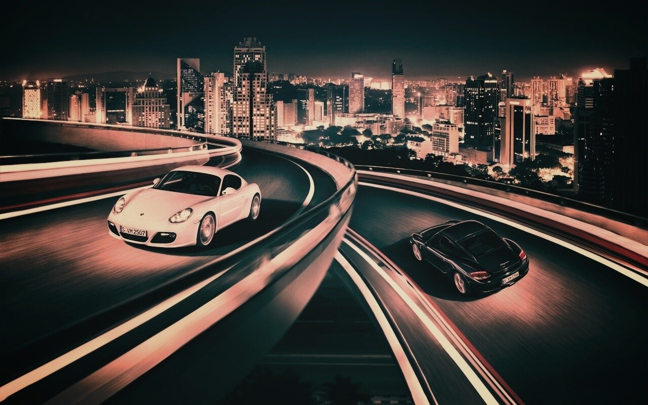 «Черный и белый Porsche на автомагистрале.»