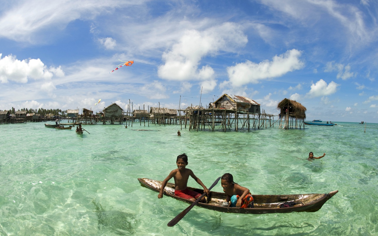 Обои для рабочего стола «Дети в лодке у поселения туземцев» 1280х800 (оригинал 6000х4000)