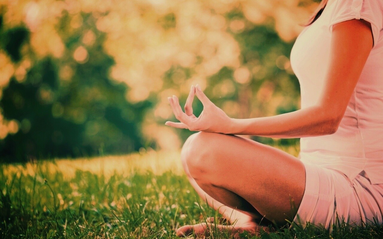 «Девушка медитирует в позе лотоса на траве»