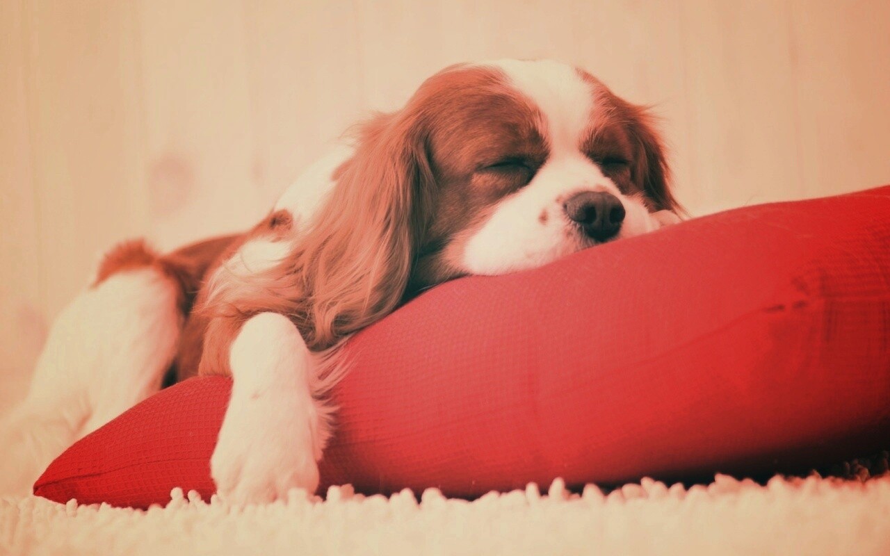 «Спящий щенок на красной подушке»