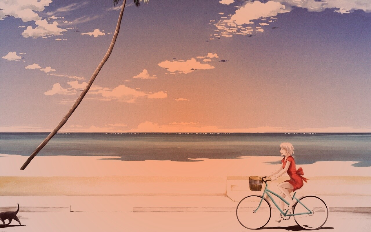 Обои для рабочего стола «Девушка едет на велосипеде вдоль берега» 1280х800 с фильтром toaster (оригинал 1355х1300)