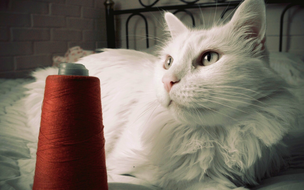 Обои для рабочего стола «Белый кот с катушкой ниток» 1280х800 с фильтром vibrance (оригинал 3648х2736)