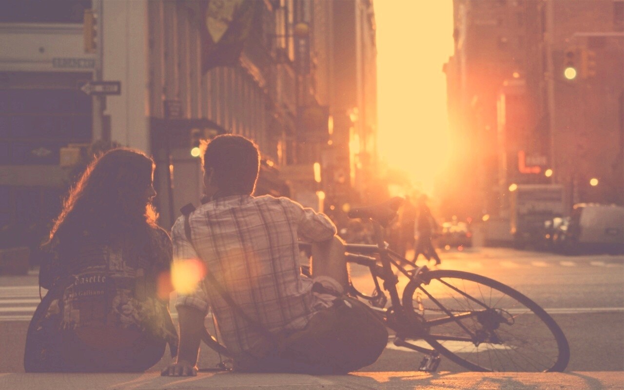 «Девушка и парень с велосипедом на закате»
