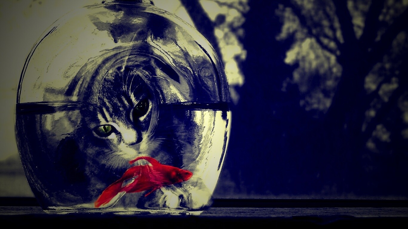 «Кот наблюдает за рыбкой в бутылке»