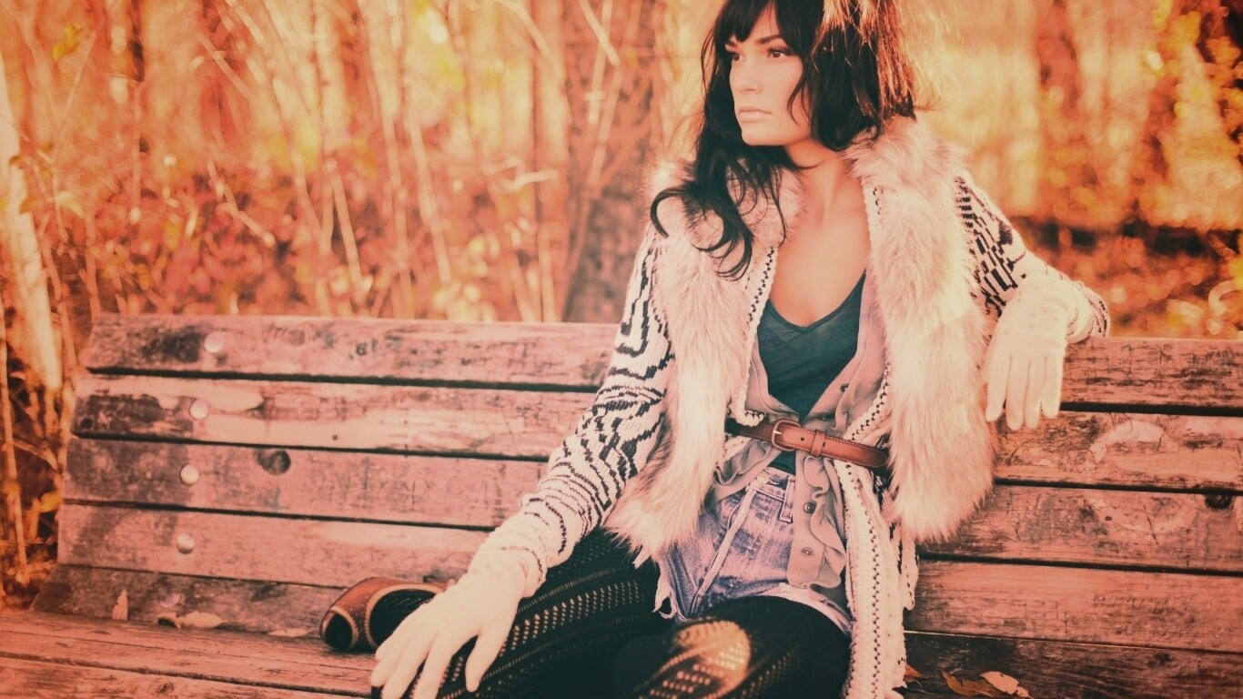 Обои для рабочего стола «Красивая девушка сидит на скамейке» 1366х768 с фильтром earlybird (оригинал 2583х1722)