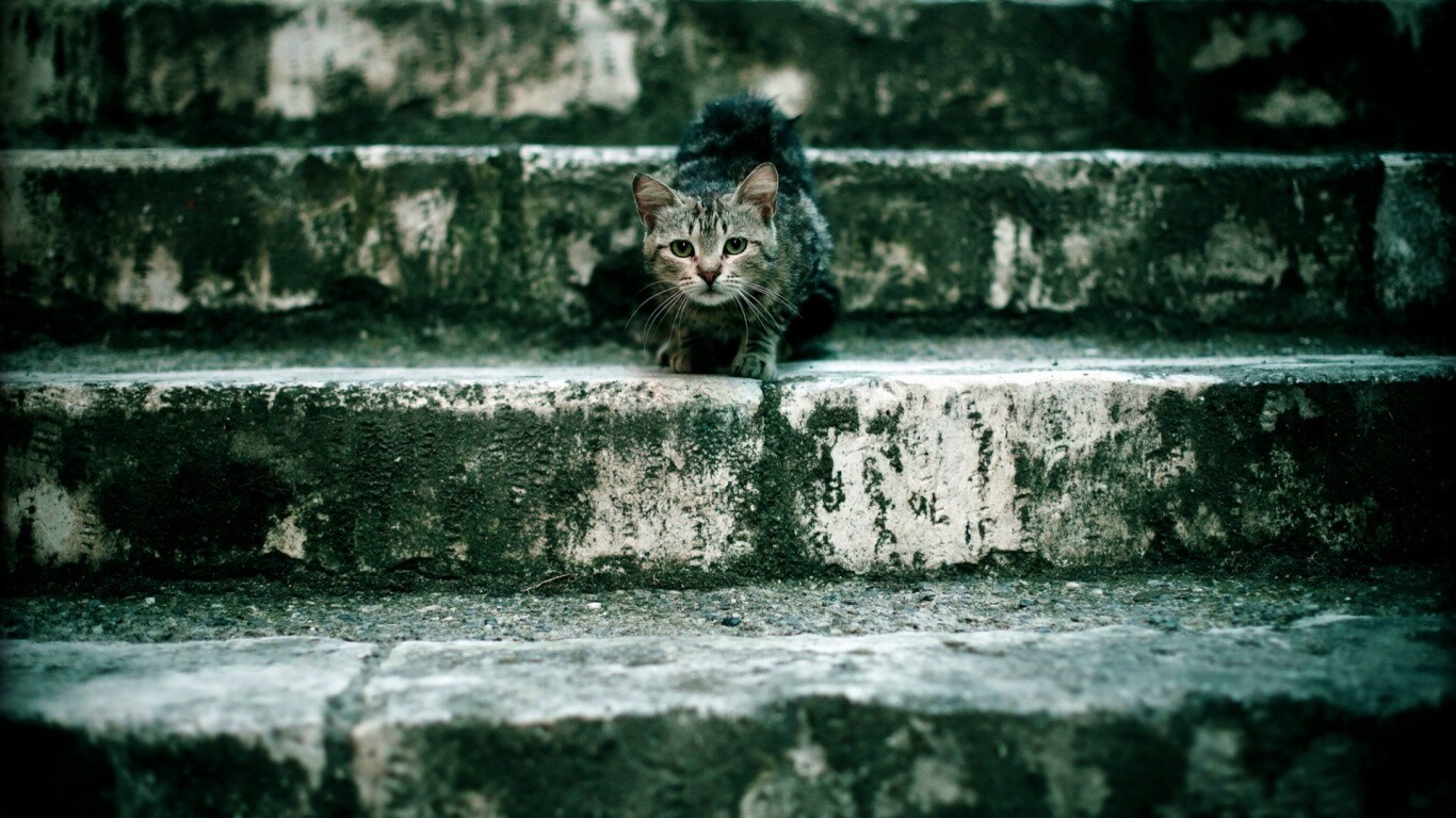 «Растрепанная кошка на ступеньках лестницы»