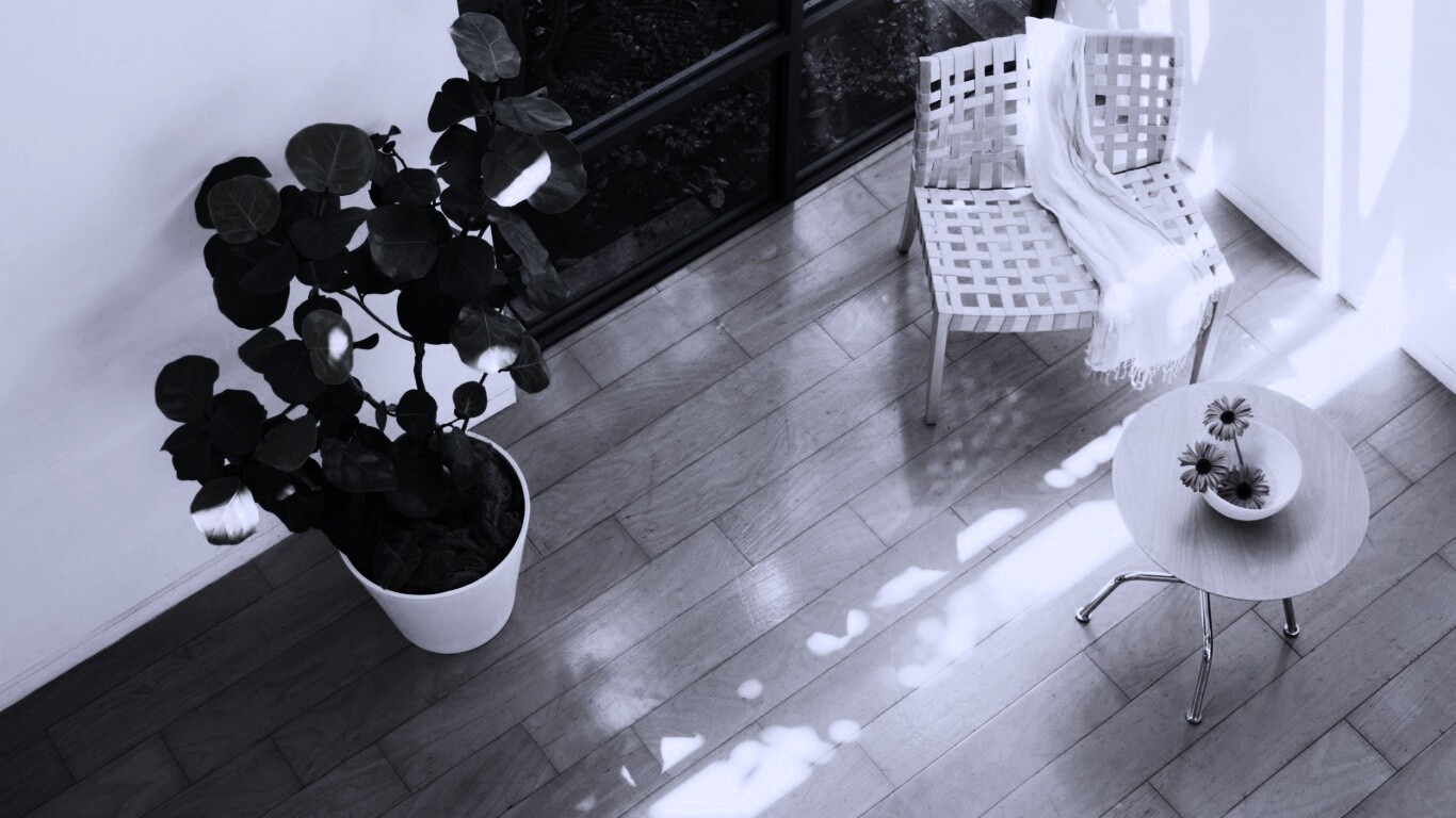 «Стул, столик и цветы в комнате»