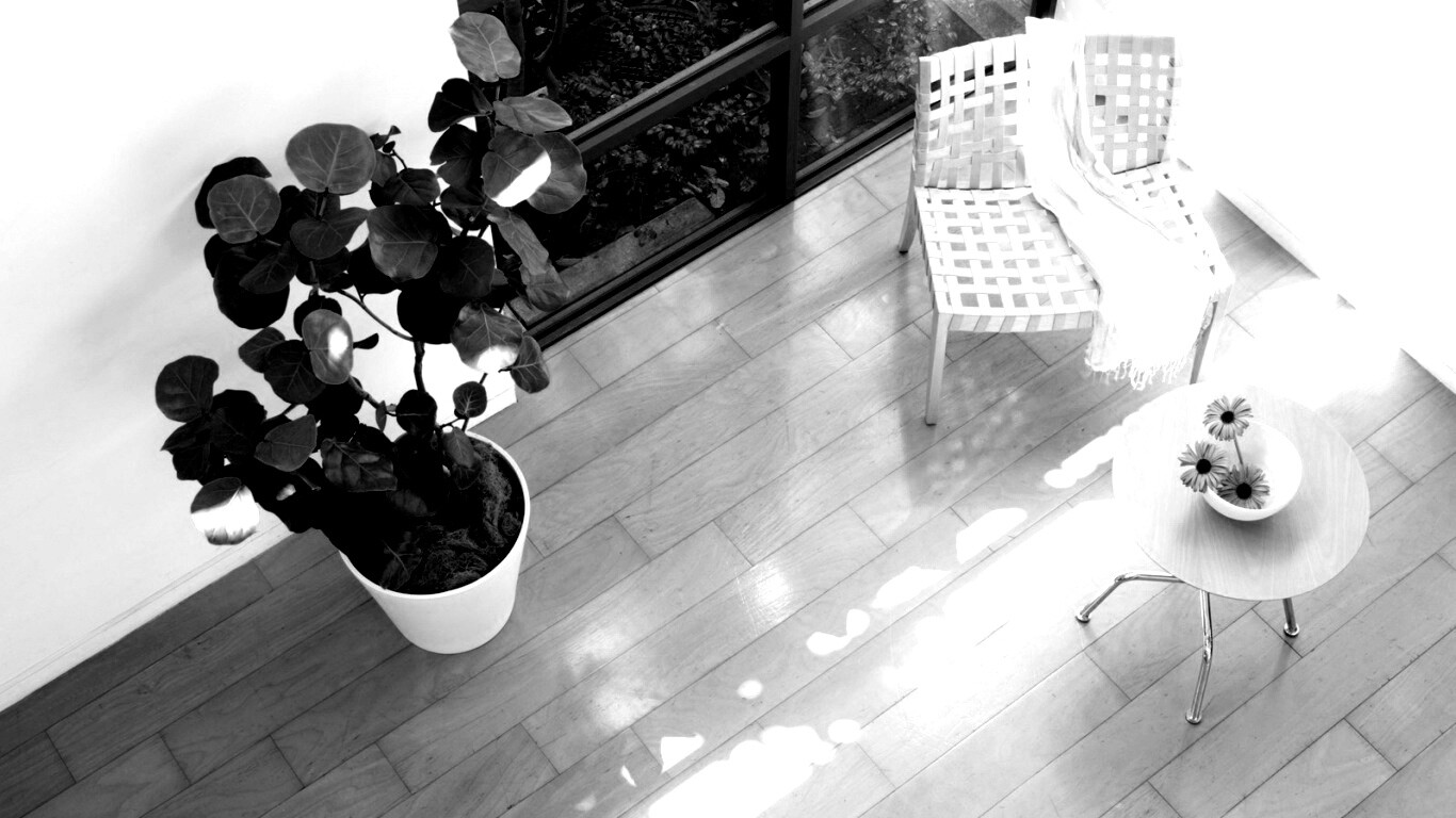 «Стул, столик и цветы в комнате»