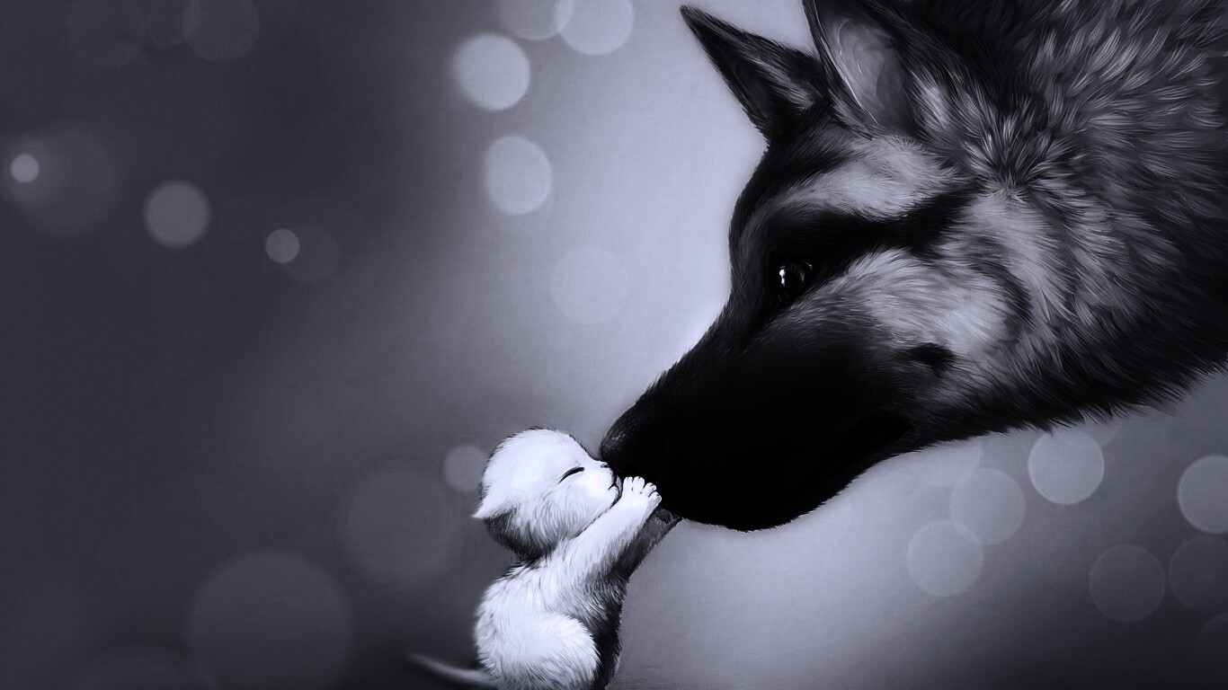 Обои для рабочего стола «Овчарка и котенок» 1366х768 с фильтром gotham (оригинал 1920х1080)