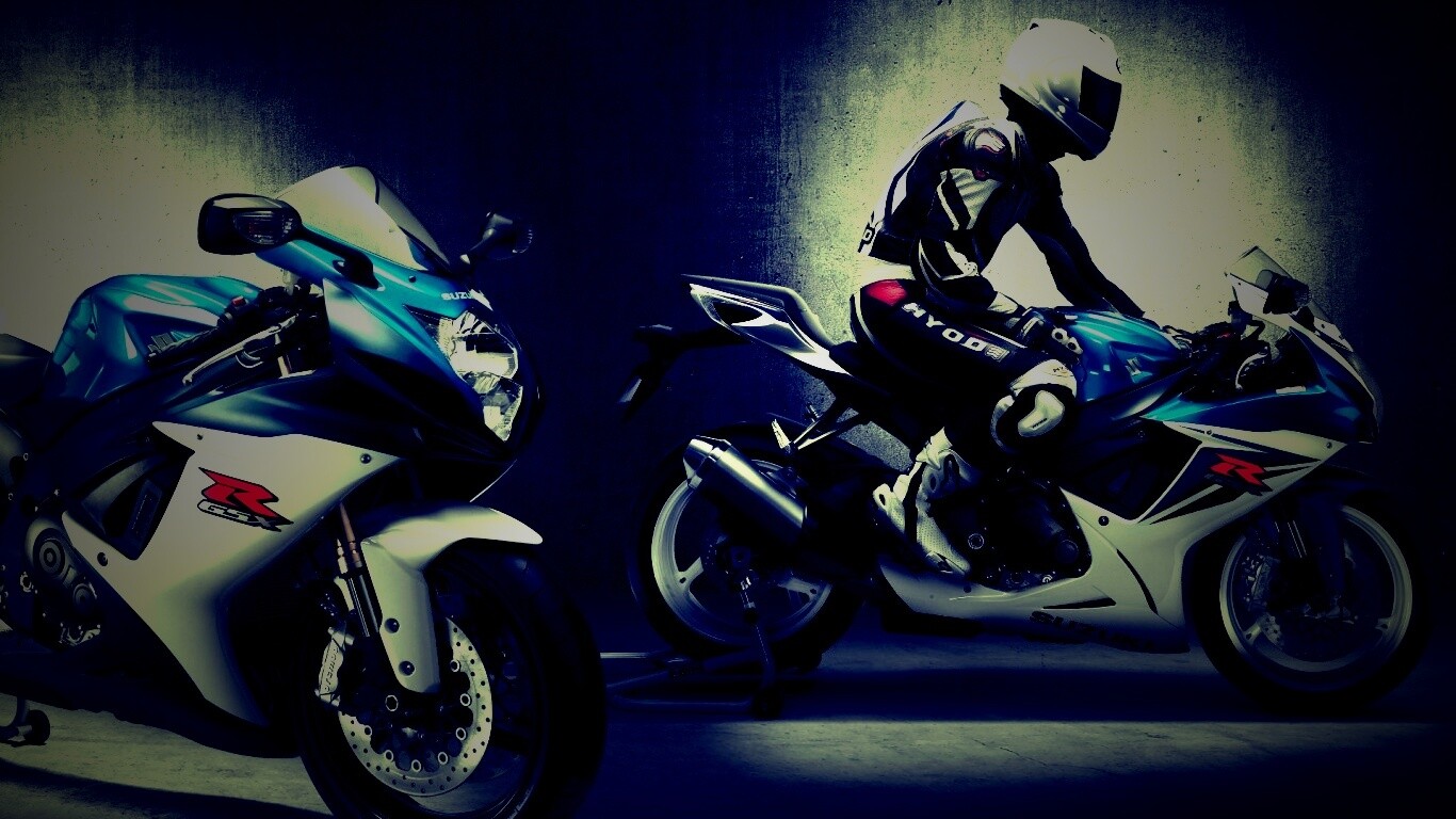 Обои для рабочего стола «Suzuki и мотоциклист» 1366х768 с фильтром lomo (оригинал 1920х1200)