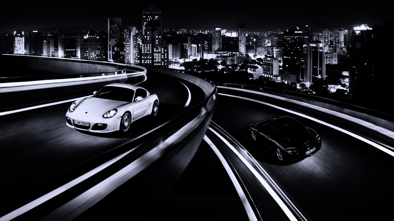 «Черный и белый Porsche на автомагистрале.»