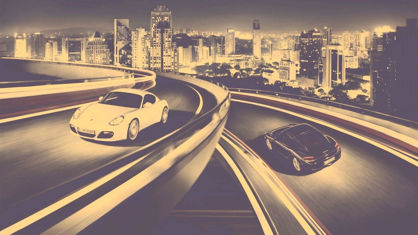 «Черный и белый Porsche на автомагистрале.»